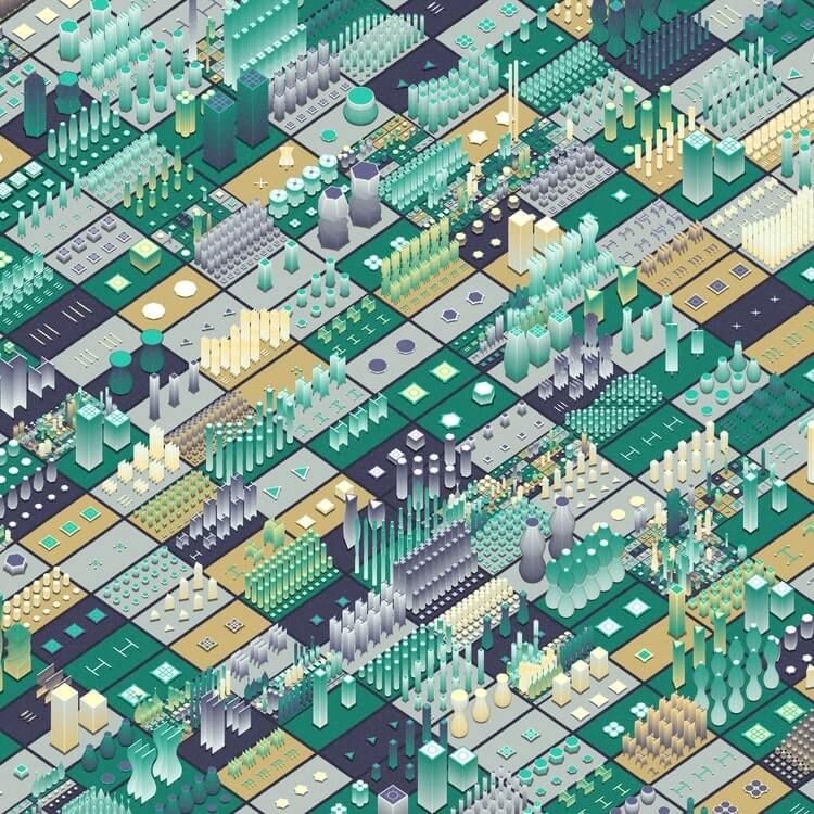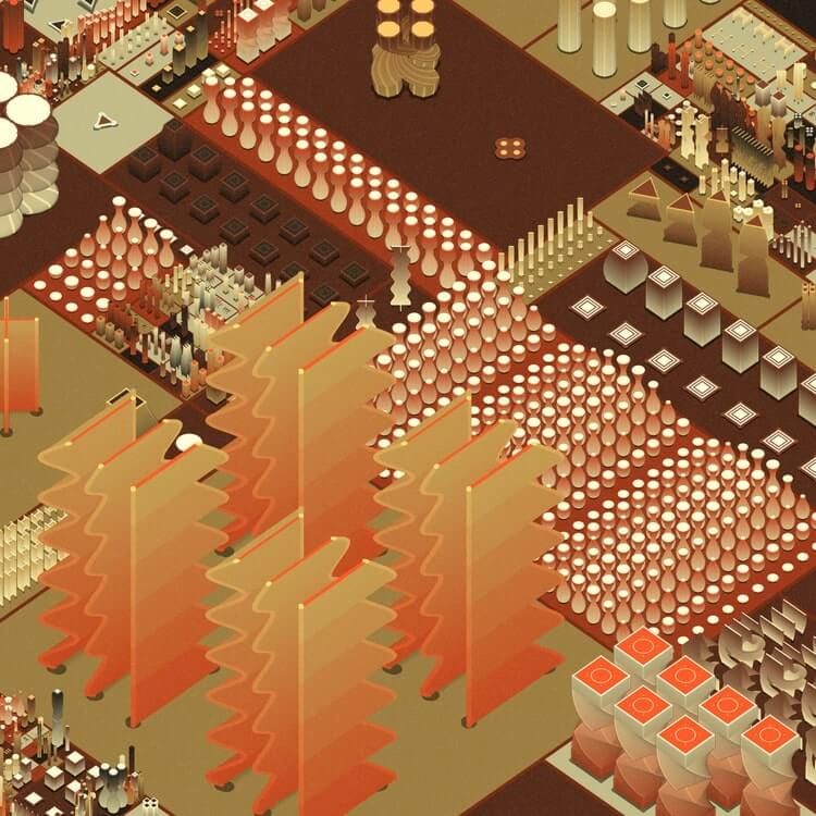 It unravels in the style of isometric illusions, each twist and turn carving out a depth, a dimension, luring the onlooker into a labyrinth of intricate details, of abstract forms blooming from the ground beneath.